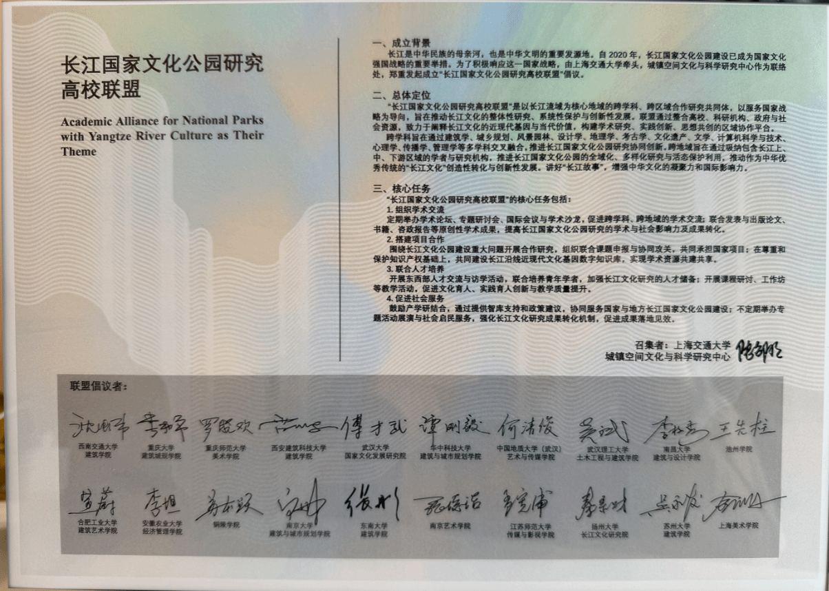 正式成为联盟成员单位。该联盟由上海交通大学城镇空间文化与科学研究中心发起,汇聚长江经济带沿线多所高校、科研机构、政府与社会优质资源,旨在构建以服务国家战略为导向,推动长江文化的整体性研究、系统性保护与创新性发展。
