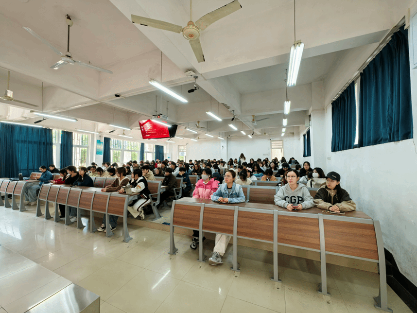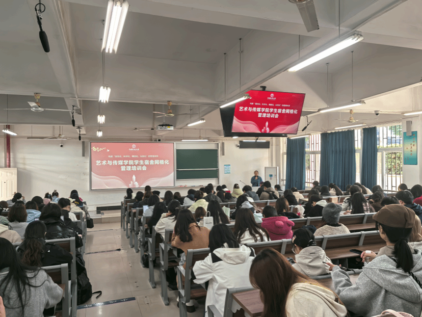 党委副书记边建华主讲,学工组辅导员曾戈晖主持,各年级宿舍长、楼栋长、楼层长、片区长参会,共同学习宿舍管理相关政策文件,明确岗位职责与工作方向。
